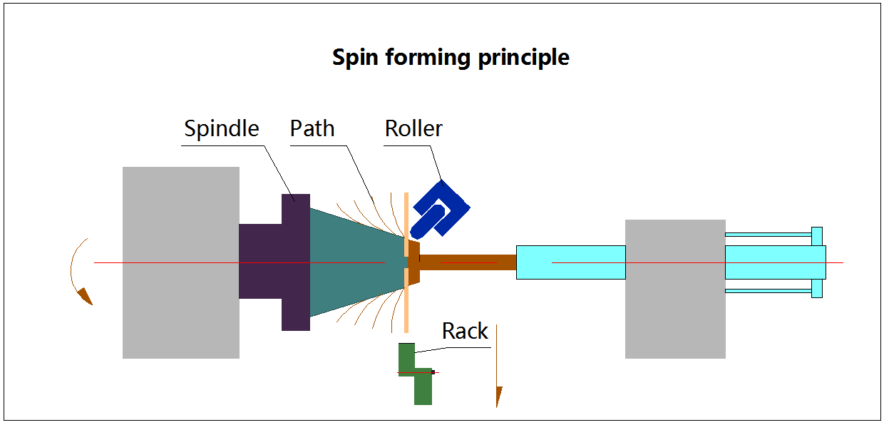 The motor starts to drive the spindle to rotate, the rack will move back, then the roller will move to form the blank according to the path of CNC program. When the spin forming ending, the hydraulic cylinder will move back, the metal spun products can remove from the mandrel (it is also call mold).